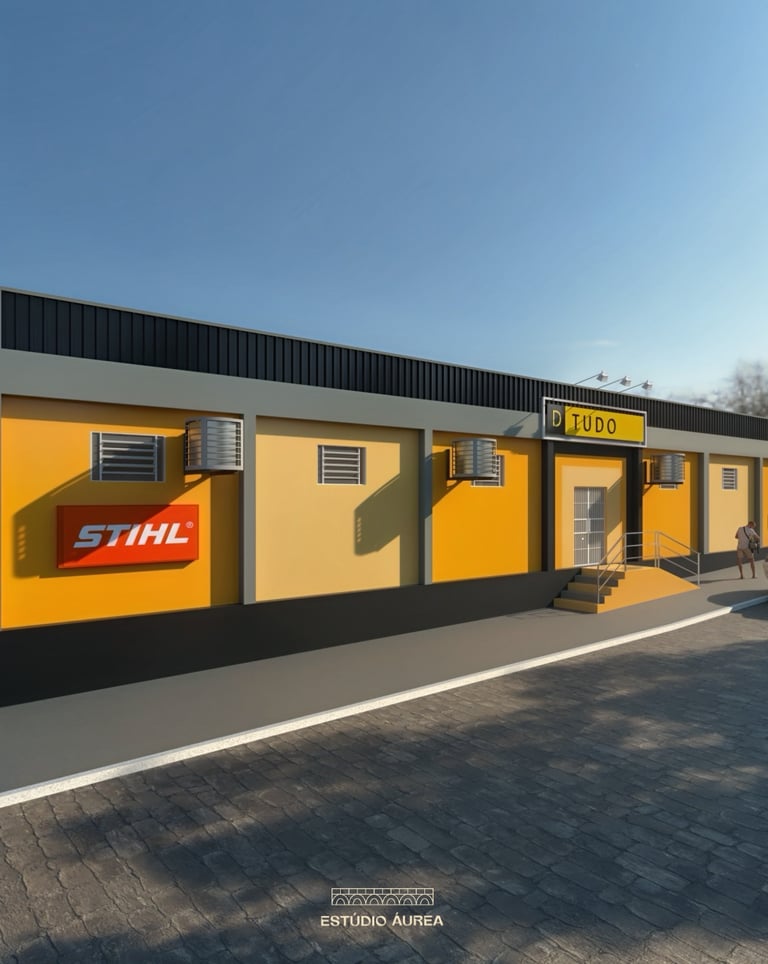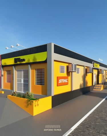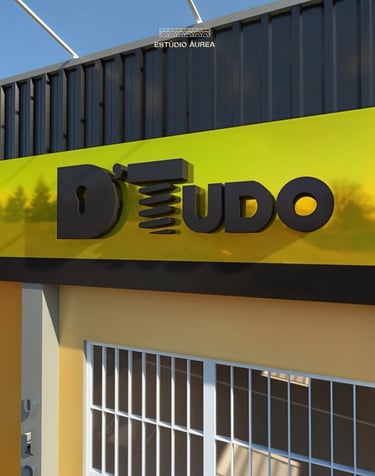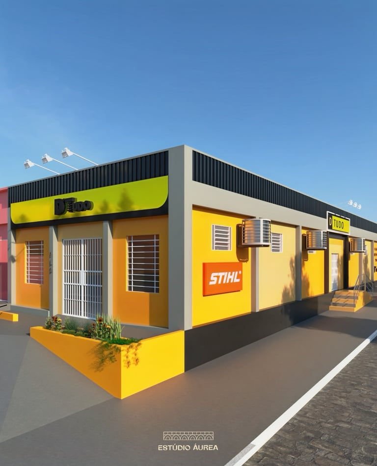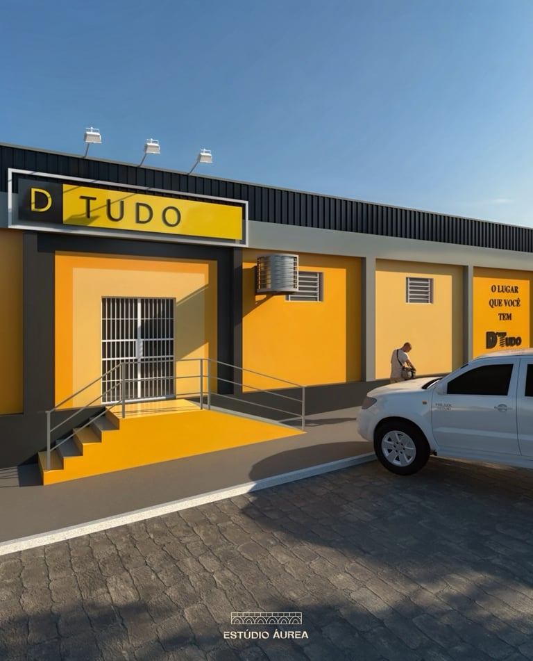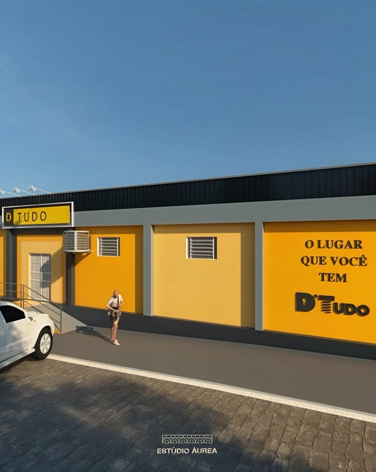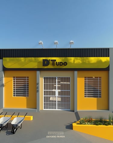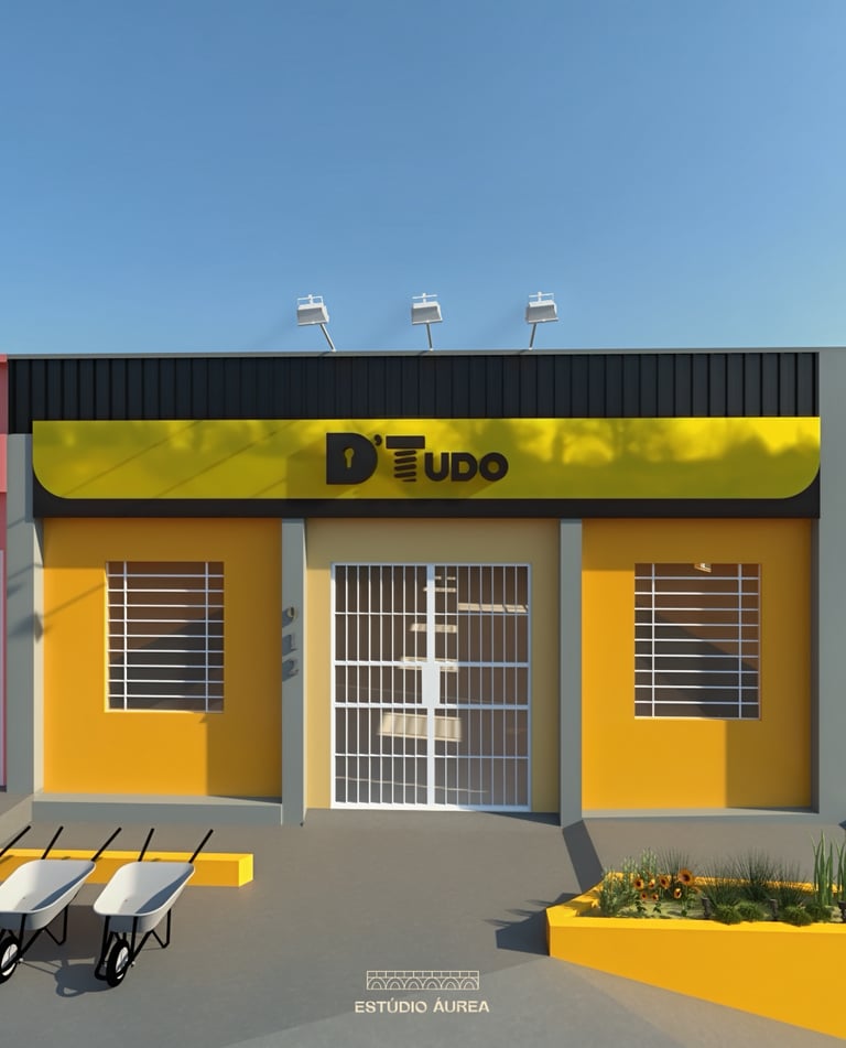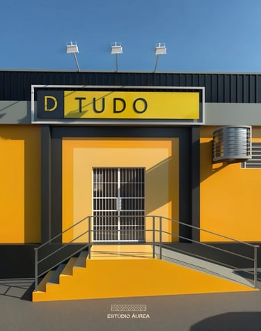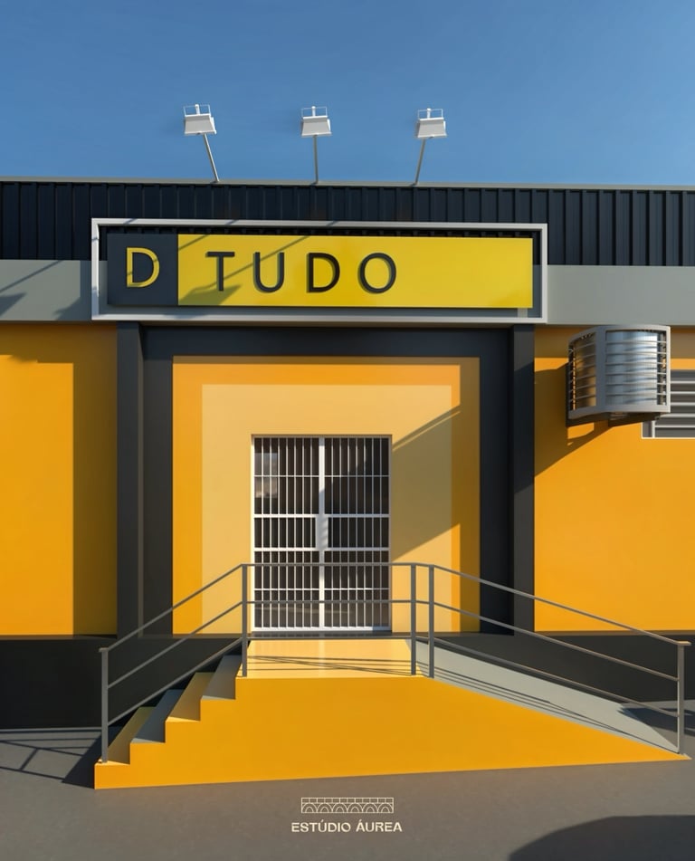 Nas paredes, trouxemos o que estava faltando: cor com intenção. Identificamos a cor como um ponto fraco do ambiente e transformamos isso em identidade e energia, aplicando a paleta da marca com dois tons de amarelo, um mais vibrante e outro mais suave, equilibrados por cinza para dar estabilidade visual e sofisticação. Essa presença de cor se estendeu também para a fachada, reforçando a personalidade da DTudo e criando um convite visual mais marcante desde a chegada.
