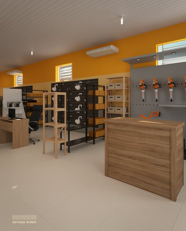 A iluminação também foi pensada como ferramenta de experiência. Recomendamos luz neutra e mais potente para áreas de apoio e depósito, e luz mais quente na área de exposição próxima à entrada, para deixar o ambiente mais acolhedor e convidativo, sem estimular alerta excessivo ao longo do dia.