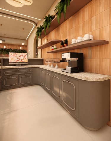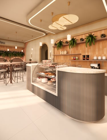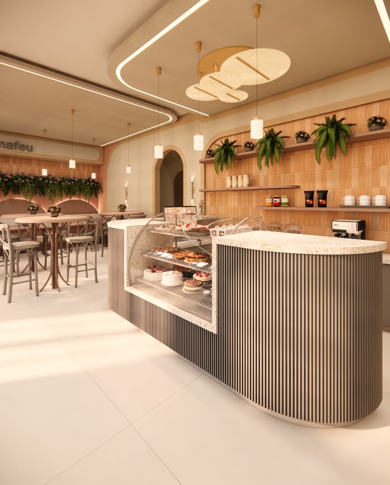 A arquitetura se une à neurociência para proporcionar um ambiente que tranquiliza, renova e abraça. A paleta de cores suaves transmite aconchego, a iluminação sutil cria conforto visual, e a biofilia traz a conexão essencial com a natureza. Inspirado na neuroarquitetura, cada forma e textura foram planejadas para despertar sensações de bem-estar, tornando a pausa para o café um verdadeiro momento de refúgio.