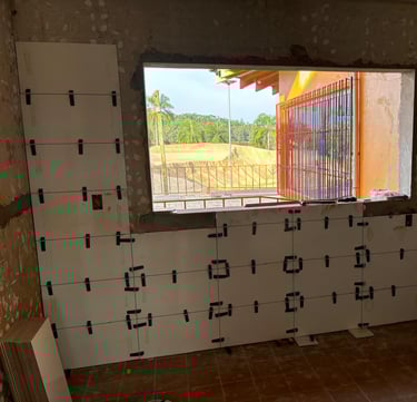 Nessa cozinha, os móveis foram produzidos de forma que pudesse ser aproveitada a pedra já existente.