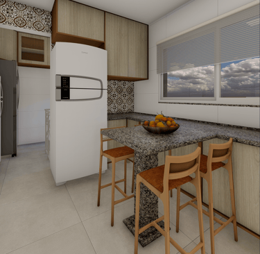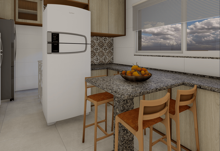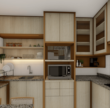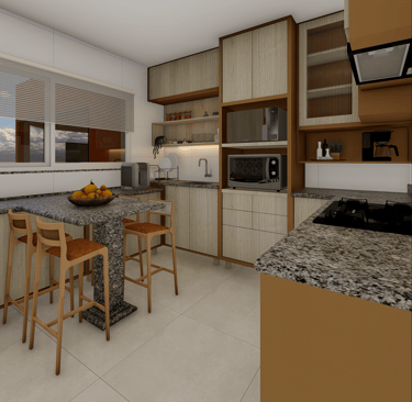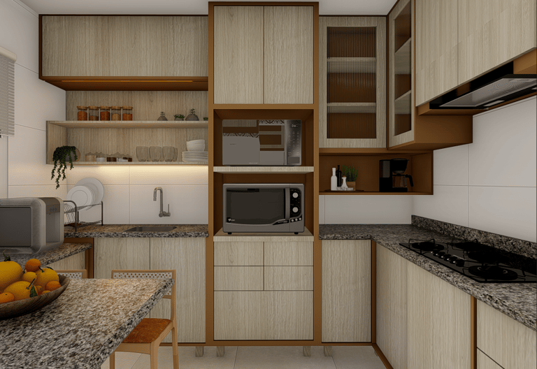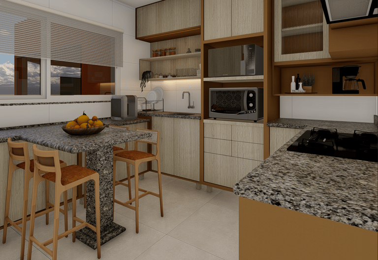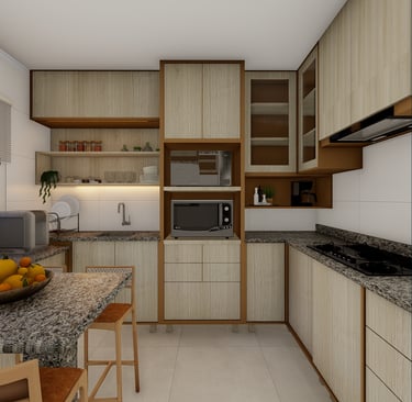 Este projeto de cozinha foi desenvolvido para unir praticidade e sofisticação, maximizando cada espaço com soluções inteligentes. O design aposta em tons amadeirados combinados com pedra natural, criando uma atmosfera acolhedora e contemporânea.