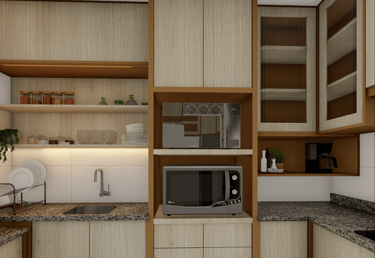 Os armários planejados oferecem um excelente aproveitamento do espaço, com nichos específicos para eletrodomésticos, portas com vidro canelado que conferem leveza ao ambiente e prateleiras iluminadas para facilitar o uso diário. A iluminação embutida realça os detalhes e traz conforto visual ao espaço.