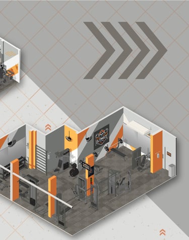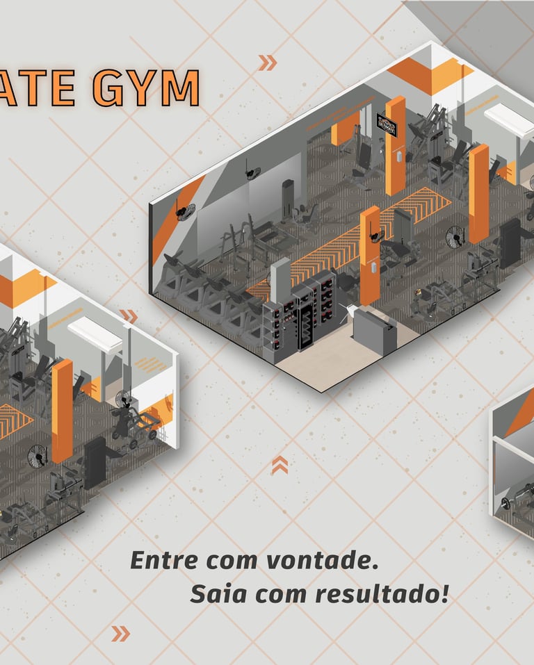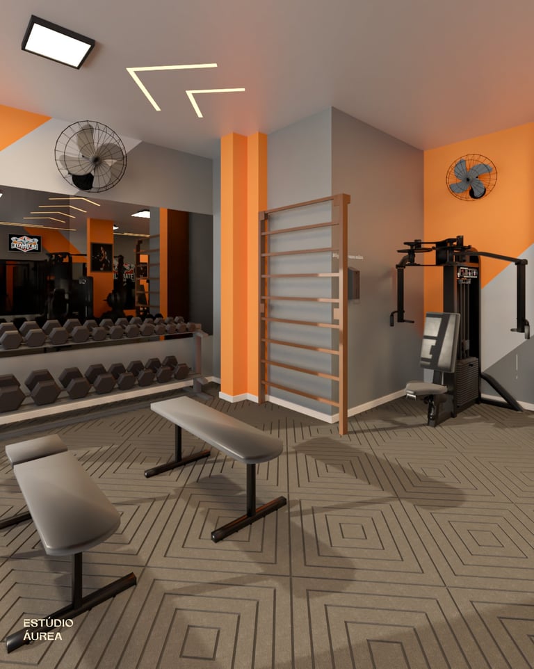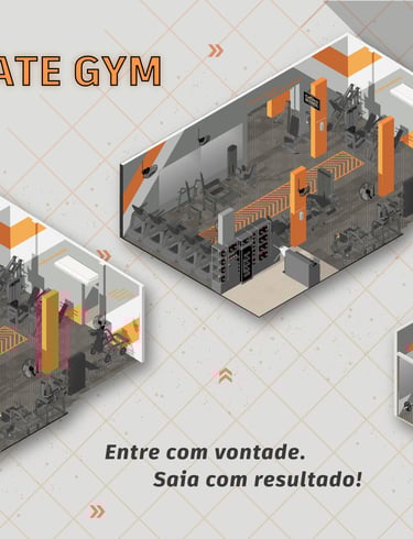 A paleta de cores mescla tons de cinza com toques vibrantes de laranja, traduzindo equilíbrio entre disciplina e motivação. Os elementos escolhidos representam força, movimento e performance, conectando o usuário ao propósito do espaço desde o primeiro olhar